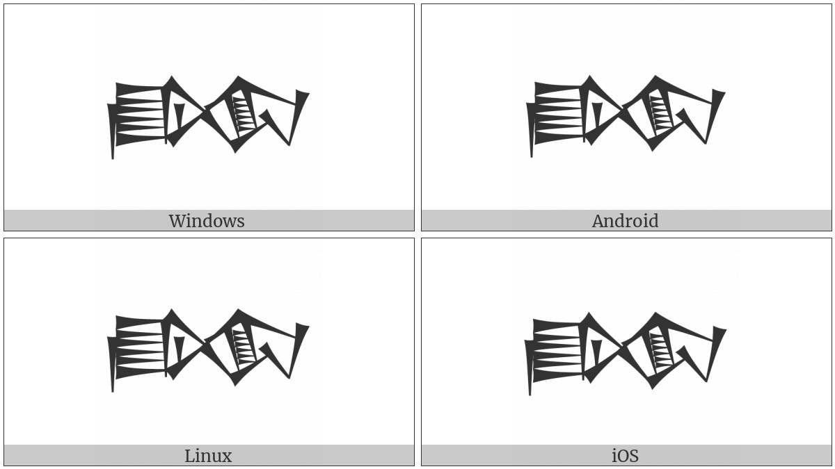 The image below shows how the “Cuneiform Sign Bahar2” symbol might look like on different operating systems. If the font in which this web site is displayed does not contain the symbol and there is no fallback font able to render it, you can use the image below to get an idea of what it should look like.