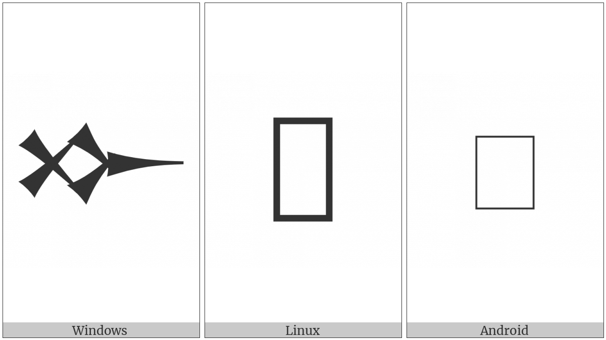 The image below shows how the “Cuneiform Sign Bu” symbol might look like on different operating systems. If the font in which this web site is displayed does not contain the symbol and there is no fallback font able to render it, you can use the image below to get an idea of what it should look like.
