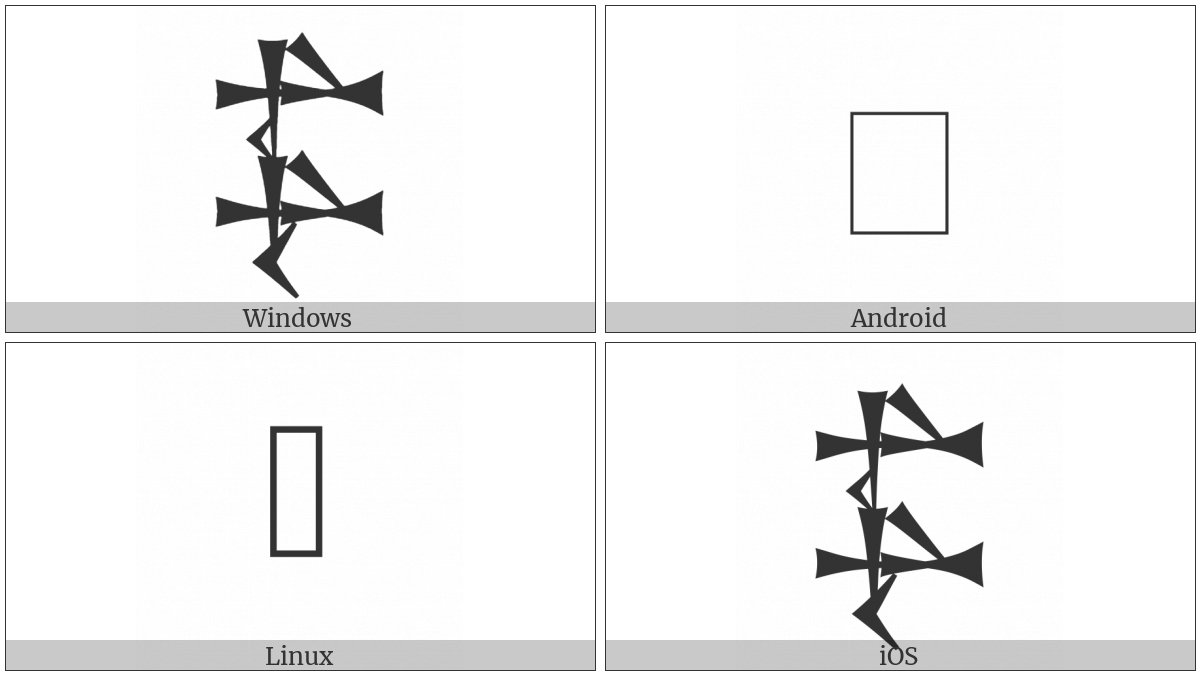 The image below shows how the “Cuneiform Sign Bulug Over Bulug” symbol might look like on different operating systems. If the font in which this web site is displayed does not contain the symbol and there is no fallback font able to render it, you can use the image below to get an idea of what it should look like.