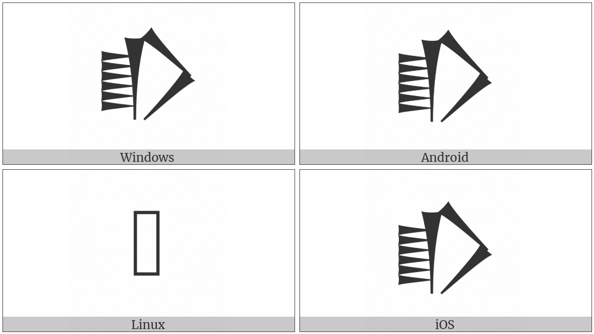 The image below shows how the “Cuneiform Sign Bur” symbol might look like on different operating systems. If the font in which this web site is displayed does not contain the symbol and there is no fallback font able to render it, you can use the image below to get an idea of what it should look like.