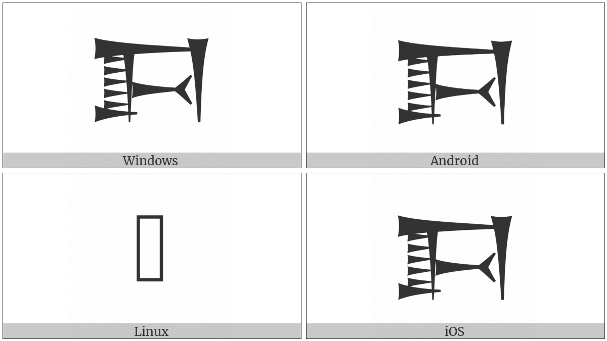 The image below shows how the “Cuneiform Sign Da” symbol might look like on different operating systems. If the font in which this web site is displayed does not contain the symbol and there is no fallback font able to render it, you can use the image below to get an idea of what it should look like.