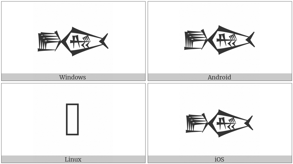The image below shows how the “Cuneiform Sign Dag Kisim5 Times Gi” symbol might look like on different operating systems. If the font in which this web site is displayed does not contain the symbol and there is no fallback font able to render it, you can use the image below to get an idea of what it should look like.