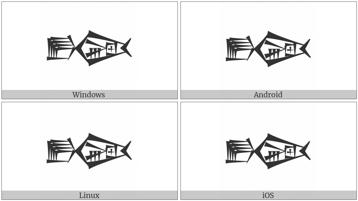 The image below shows how the “Cuneiform Sign Dag Kisim5 Times Ir Plus Lu” symbol might look like on different operating systems. If the font in which this web site is displayed does not contain the symbol and there is no fallback font able to render it, you can use the image below to get an idea of what it should look like.