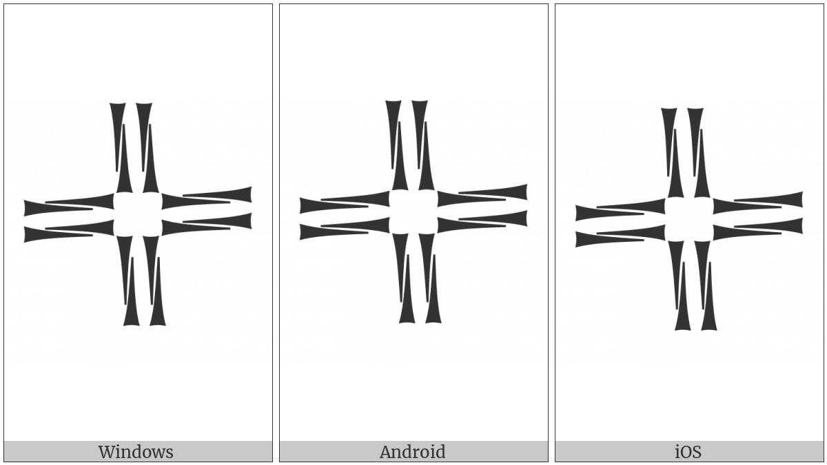 The image below shows how the “Cuneiform Sign Idim Over Idim Squared” symbol might look like on different operating systems. If the font in which this web site is displayed does not contain the symbol and there is no fallback font able to render it, you can use the image below to get an idea of what it should look like.