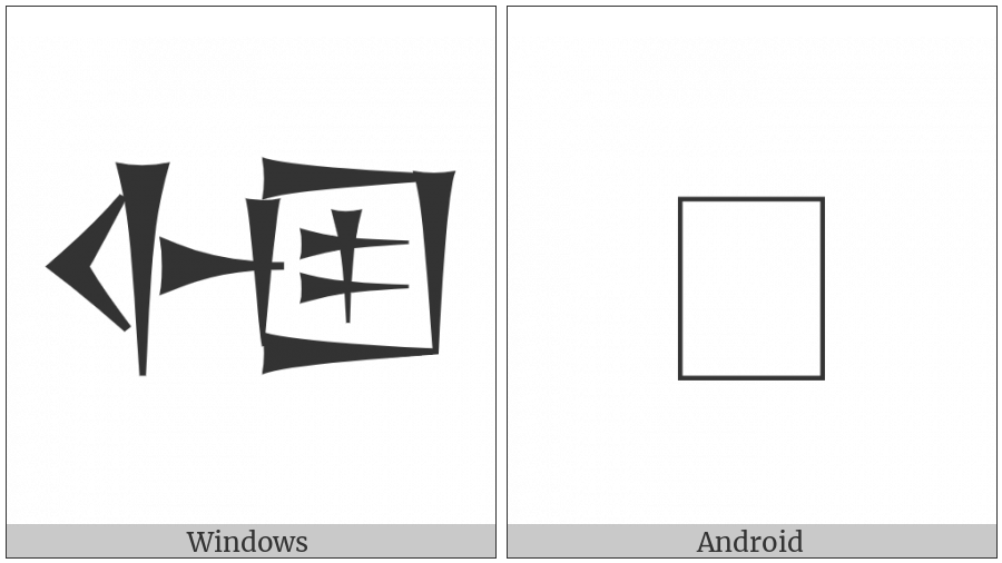 The image below shows how the “Cuneiform Sign Igi Dib” symbol might look like on different operating systems. If the font in which this web site is displayed does not contain the symbol and there is no fallback font able to render it, you can use the image below to get an idea of what it should look like.