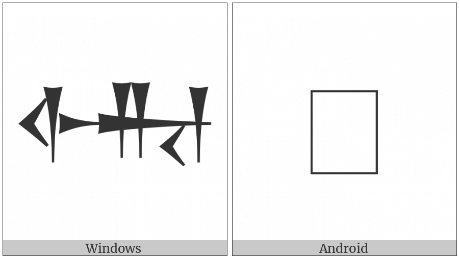 The image below shows how the “Cuneiform Sign Igi Ri” symbol might look like on different operating systems. If the font in which this web site is displayed does not contain the symbol and there is no fallback font able to render it, you can use the image below to get an idea of what it should look like.