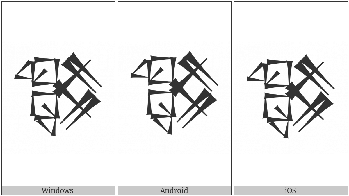 The image below shows how the “Cuneiform Sign Im Crossing Im” symbol might look like on different operating systems. If the font in which this web site is displayed does not contain the symbol and there is no fallback font able to render it, you can use the image below to get an idea of what it should look like.