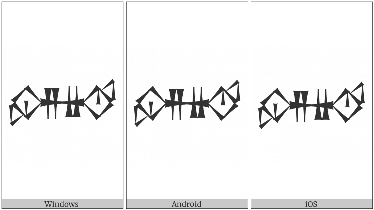 The image below shows how the “Cuneiform Sign Im Opposing Im” symbol might look like on different operating systems. If the font in which this web site is displayed does not contain the symbol and there is no fallback font able to render it, you can use the image below to get an idea of what it should look like.