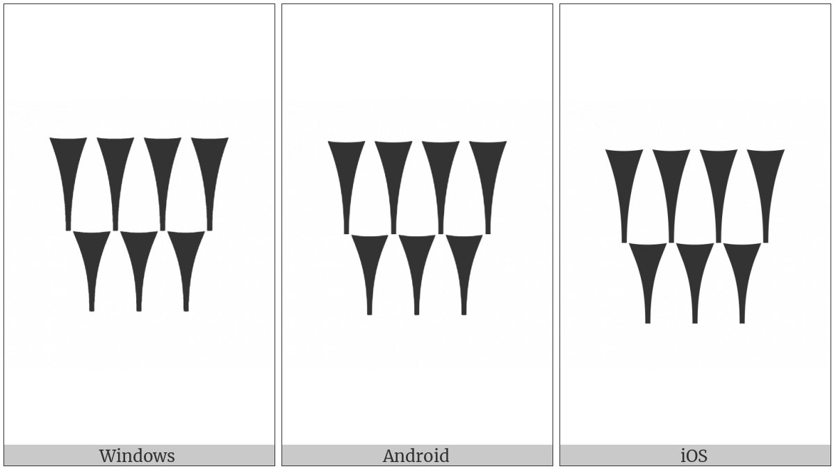 The image below shows how the “Cuneiform Sign Imin” symbol might look like on different operating systems. If the font in which this web site is displayed does not contain the symbol and there is no fallback font able to render it, you can use the image below to get an idea of what it should look like.