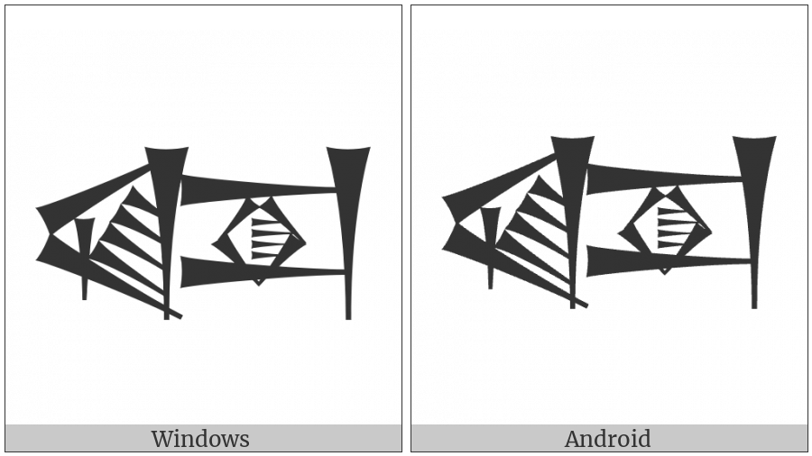 The image below shows how the “Cuneiform Sign Ka Times Ki” symbol might look like on different operating systems. If the font in which this web site is displayed does not contain the symbol and there is no fallback font able to render it, you can use the image below to get an idea of what it should look like.