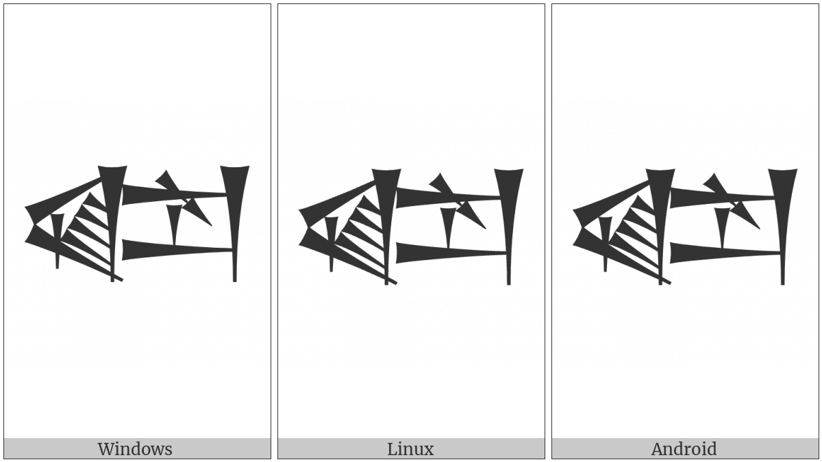 The image below shows how the “Cuneiform Sign Ka Times Tar” symbol might look like on different operating systems. If the font in which this web site is displayed does not contain the symbol and there is no fallback font able to render it, you can use the image below to get an idea of what it should look like.