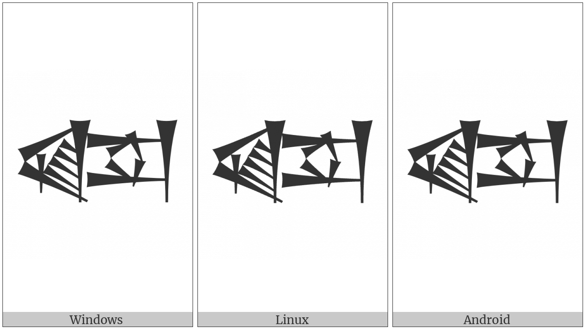 The image below shows how the “Cuneiform Sign Ka Times Ud” symbol might look like on different operating systems. If the font in which this web site is displayed does not contain the symbol and there is no fallback font able to render it, you can use the image below to get an idea of what it should look like.