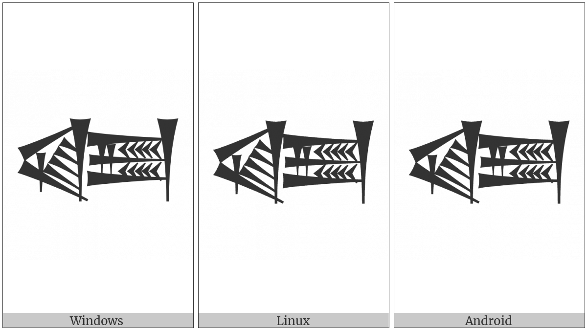 The image below shows how the “Cuneiform Sign Ka Times Zi” symbol might look like on different operating systems. If the font in which this web site is displayed does not contain the symbol and there is no fallback font able to render it, you can use the image below to get an idea of what it should look like.