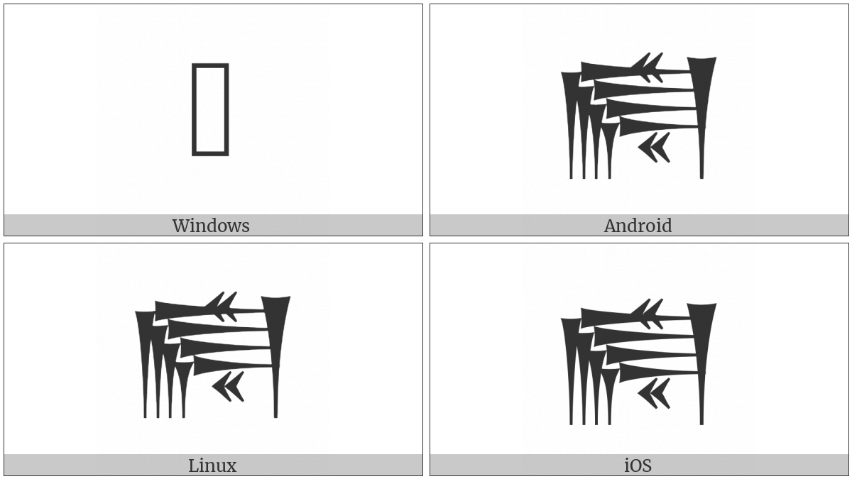 The image below shows how the “Cuneiform Sign Ka2” symbol might look like on different operating systems. If the font in which this web site is displayed does not contain the symbol and there is no fallback font able to render it, you can use the image below to get an idea of what it should look like.