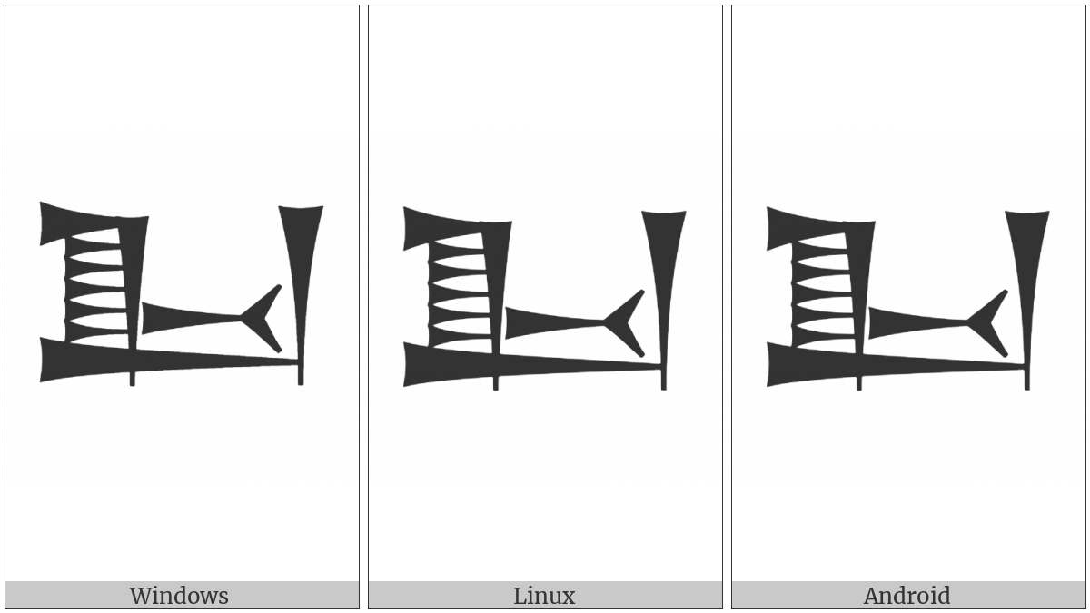 The image below shows how the “Cuneiform Sign Kab” symbol might look like on different operating systems. If the font in which this web site is displayed does not contain the symbol and there is no fallback font able to render it, you can use the image below to get an idea of what it should look like.