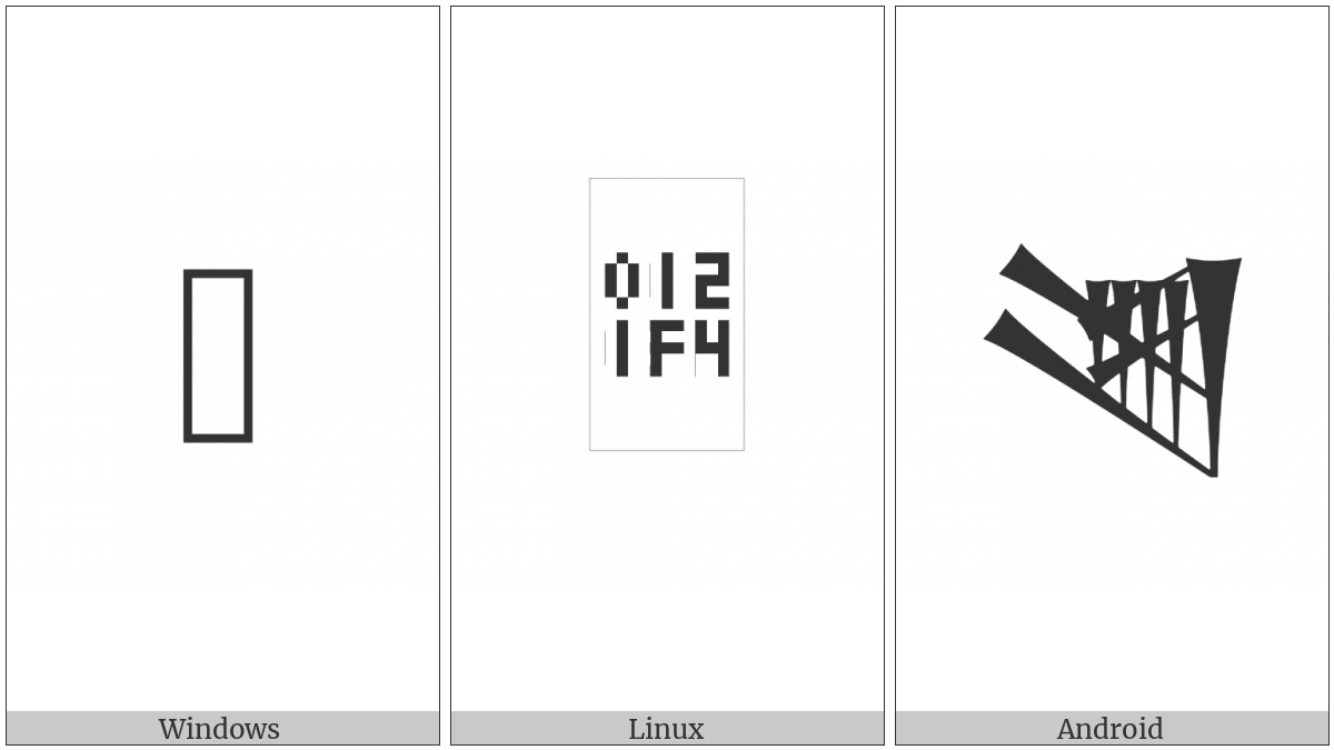 The image below shows how the “Cuneiform Sign Lam” symbol might look like on different operating systems. If the font in which this web site is displayed does not contain the symbol and there is no fallback font able to render it, you can use the image below to get an idea of what it should look like.