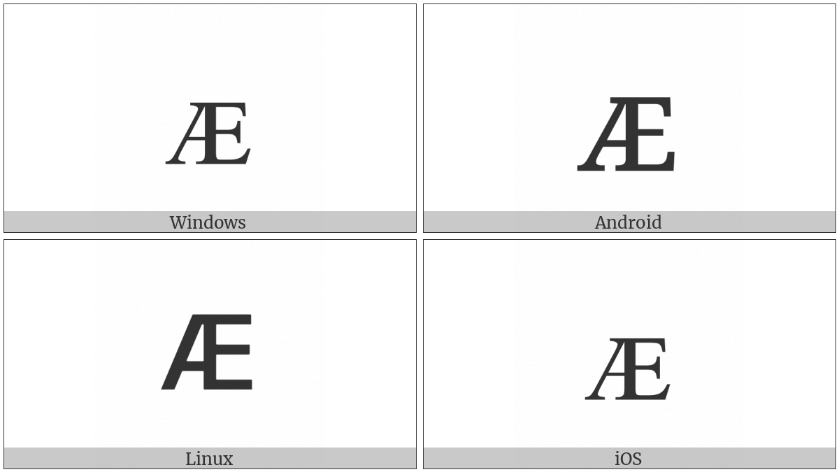 The image below shows how the “Latin Letter Small Capital Ae” symbol might look like on different operating systems. If the font in which this web site is displayed does not contain the symbol and there is no fallback font able to render it, you can use the image below to get an idea of what it should look like.
