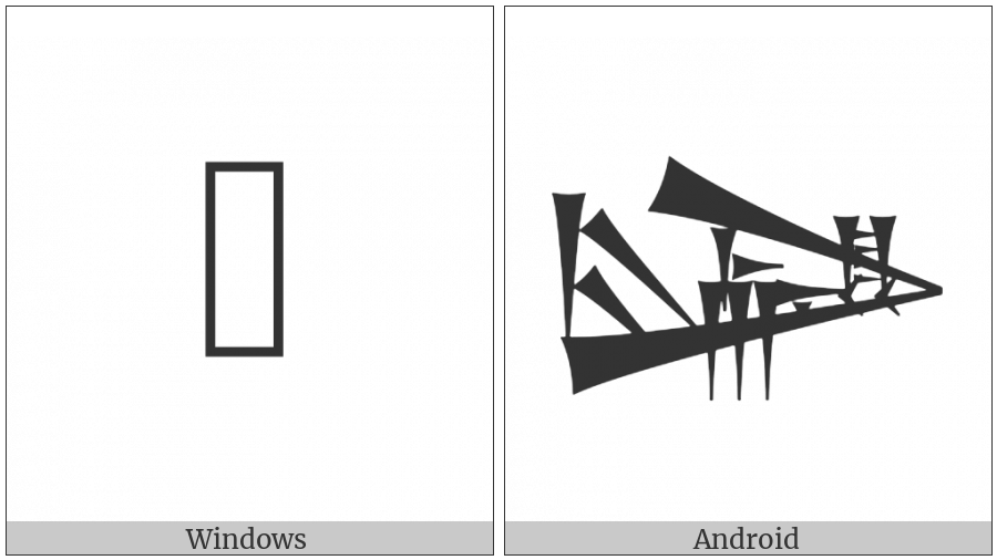 The image below shows how the “Cuneiform Sign Lu2 Times Me Plus En” symbol might look like on different operating systems. If the font in which this web site is displayed does not contain the symbol and there is no fallback font able to render it, you can use the image below to get an idea of what it should look like.