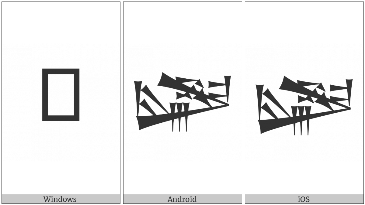 The image below shows how the “Cuneiform Sign Lu2 Times Ne” symbol might look like on different operating systems. If the font in which this web site is displayed does not contain the symbol and there is no fallback font able to render it, you can use the image below to get an idea of what it should look like.