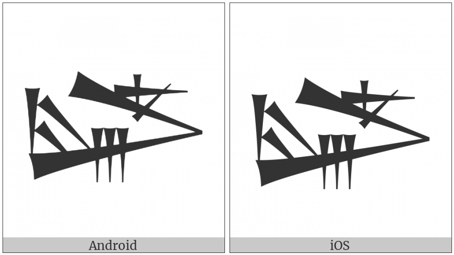 The image below shows how the “Cuneiform Sign Lu2 Times Nu” symbol might look like on different operating systems. If the font in which this web site is displayed does not contain the symbol and there is no fallback font able to render it, you can use the image below to get an idea of what it should look like.