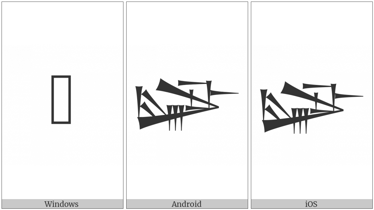 The image below shows how the “Cuneiform Sign Lu2 Times Si Plus Ash” symbol might look like on different operating systems. If the font in which this web site is displayed does not contain the symbol and there is no fallback font able to render it, you can use the image below to get an idea of what it should look like.