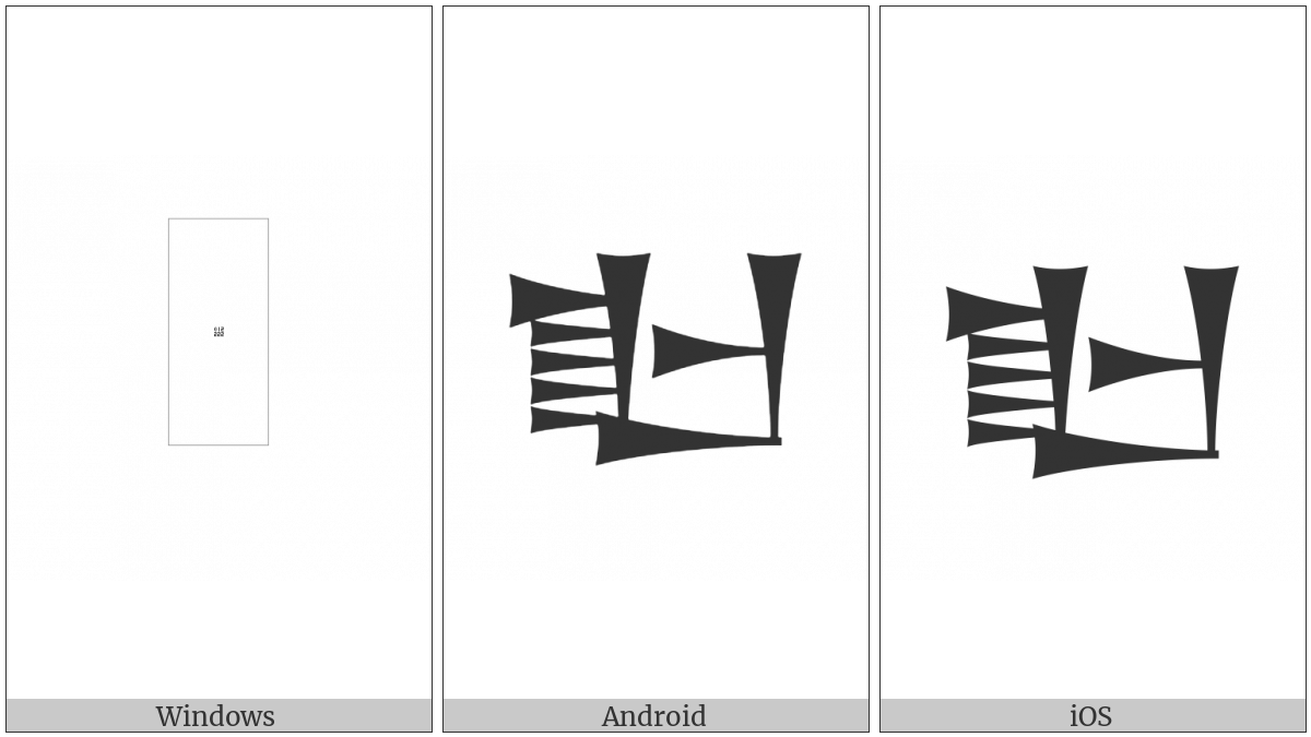 The image below shows how the “Cuneiform Sign Ma Gunu” symbol might look like on different operating systems. If the font in which this web site is displayed does not contain the symbol and there is no fallback font able to render it, you can use the image below to get an idea of what it should look like.