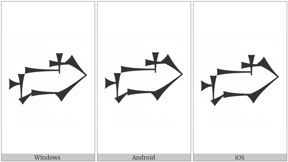 The image below shows how the “Cuneiform Sign Mah” symbol might look like on different operating systems. If the font in which this web site is displayed does not contain the symbol and there is no fallback font able to render it, you can use the image below to get an idea of what it should look like.
