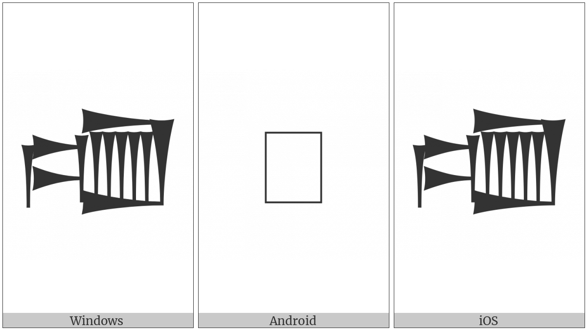 The image below shows how the “Cuneiform Sign Mes” symbol might look like on different operating systems. If the font in which this web site is displayed does not contain the symbol and there is no fallback font able to render it, you can use the image below to get an idea of what it should look like.