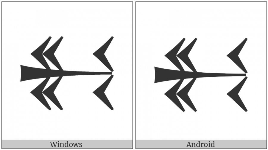 The image below shows how the “Cuneiform Sign Mu” symbol might look like on different operating systems. If the font in which this web site is displayed does not contain the symbol and there is no fallback font able to render it, you can use the image below to get an idea of what it should look like.