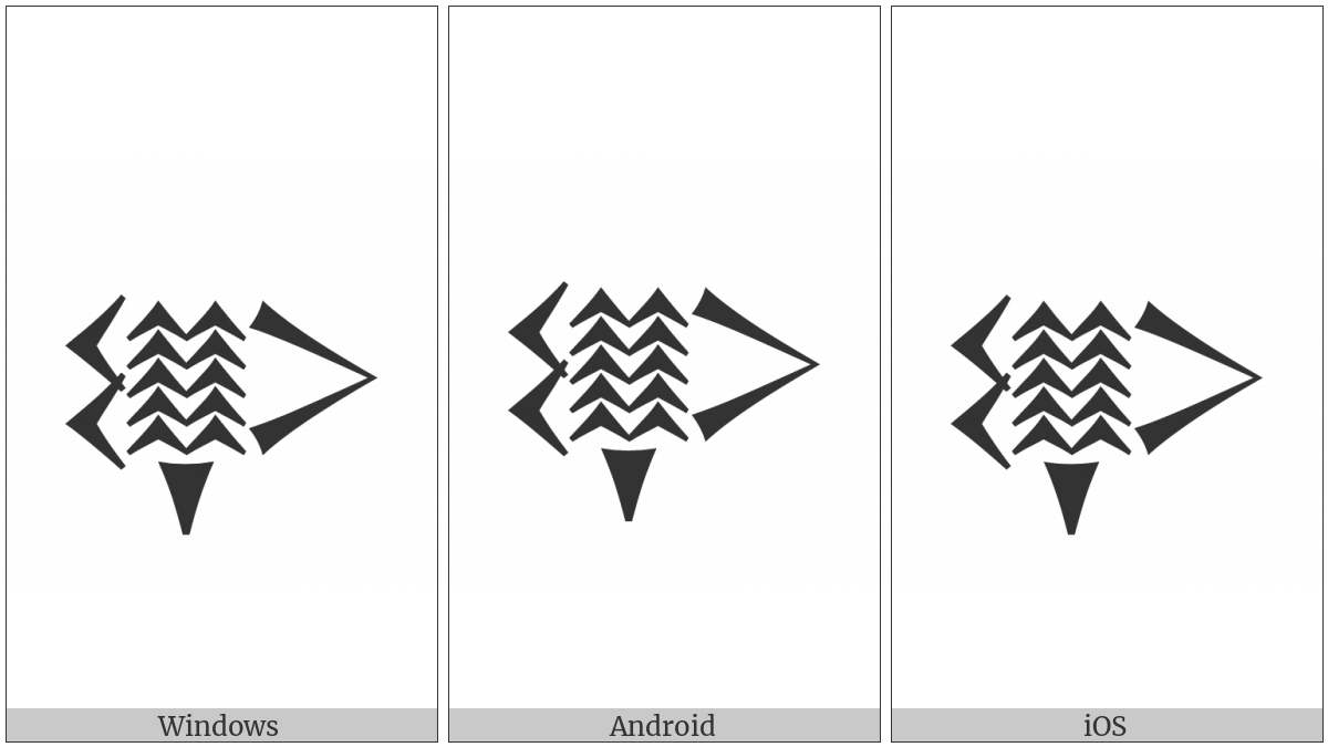 The image below shows how the “Cuneiform Sign Naga” symbol might look like on different operating systems. If the font in which this web site is displayed does not contain the symbol and there is no fallback font able to render it, you can use the image below to get an idea of what it should look like.