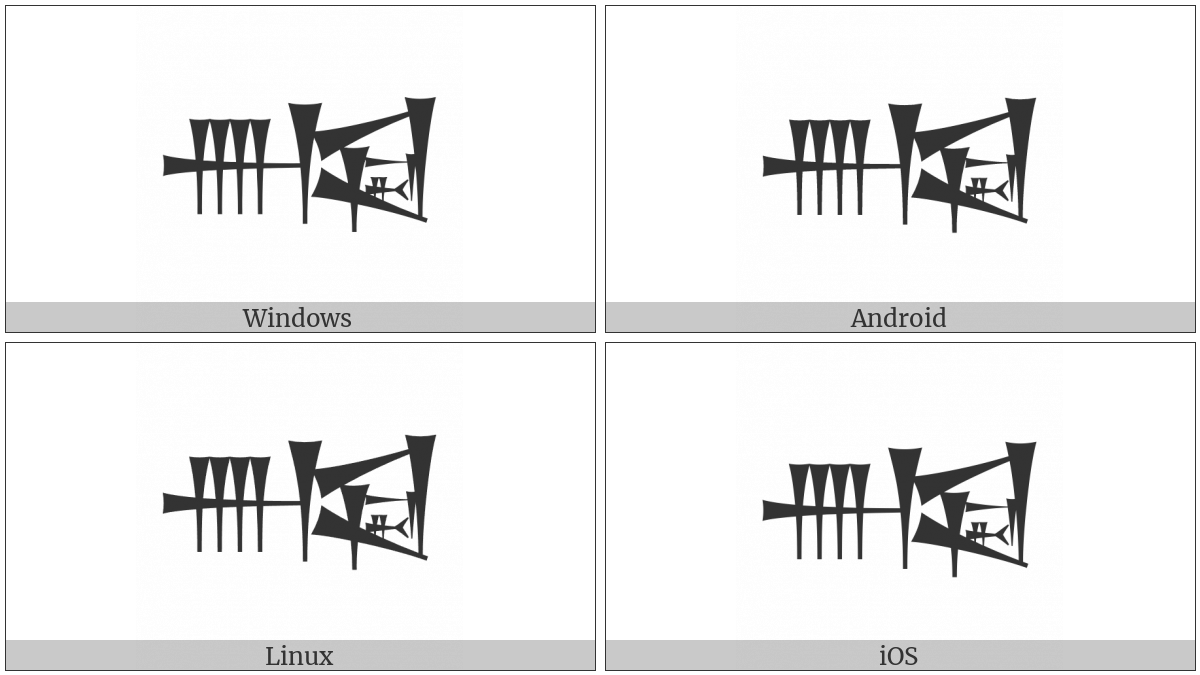 The image below shows how the “Cuneiform Sign Nun Lagar Times Ush” symbol might look like on different operating systems. If the font in which this web site is displayed does not contain the symbol and there is no fallback font able to render it, you can use the image below to get an idea of what it should look like.