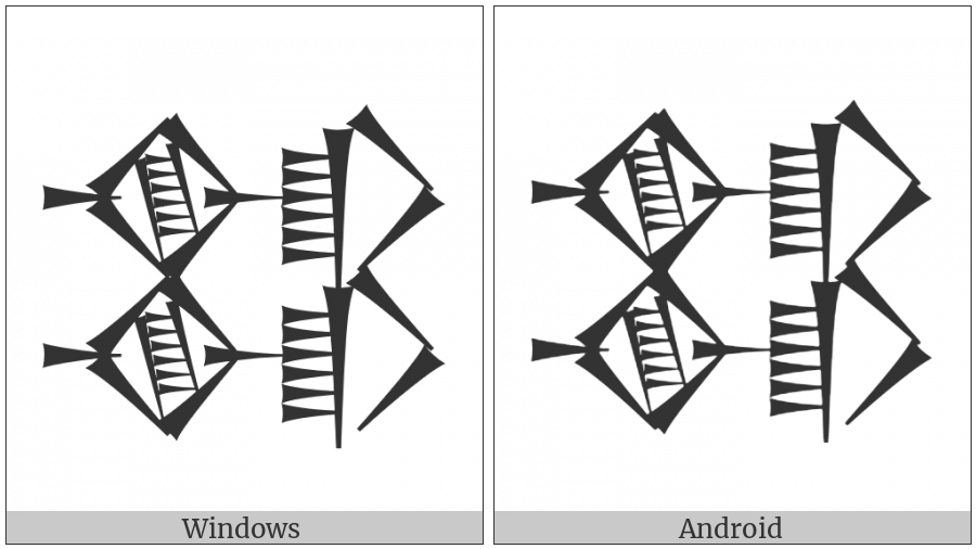 The image below shows how the “Cuneiform Sign Shir Over Shir Bur Over Bur” symbol might look like on different operating systems. If the font in which this web site is displayed does not contain the symbol and there is no fallback font able to render it, you can use the image below to get an idea of what it should look like.
