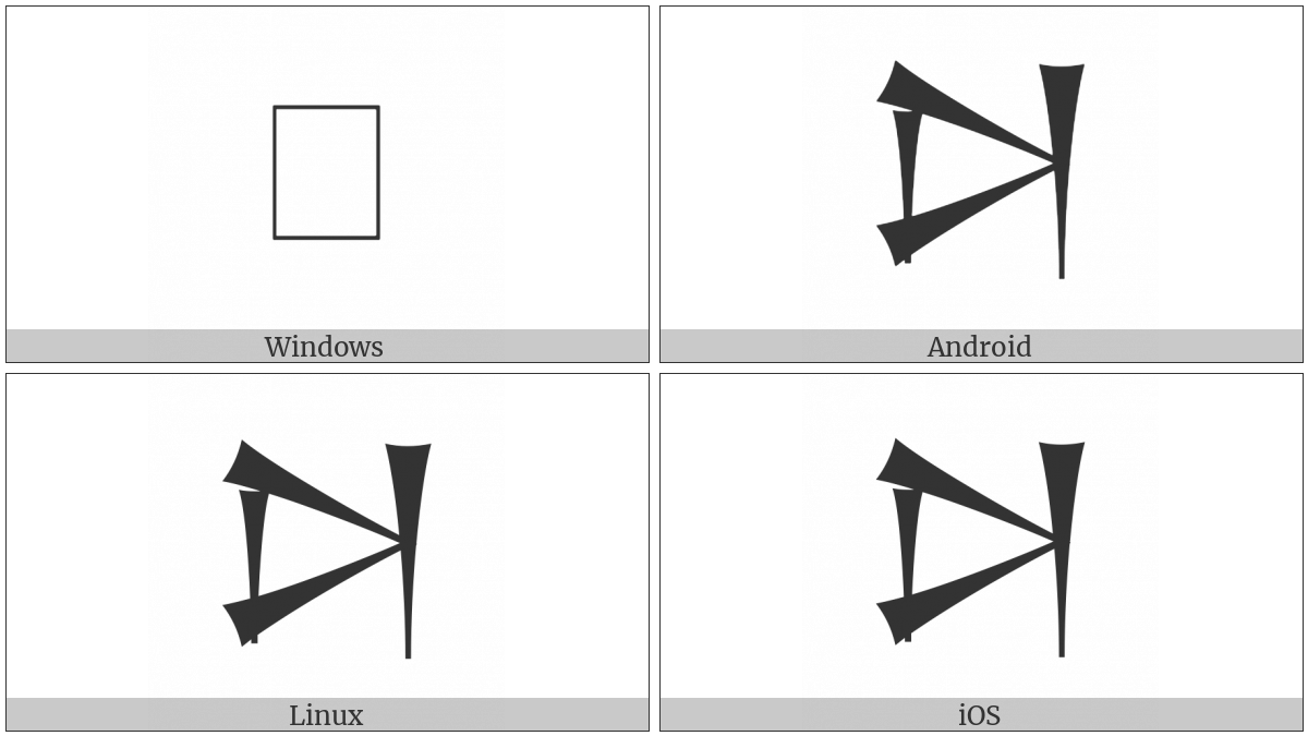 The image below shows how the “Cuneiform Sign Shita” symbol might look like on different operating systems. If the font in which this web site is displayed does not contain the symbol and there is no fallback font able to render it, you can use the image below to get an idea of what it should look like.