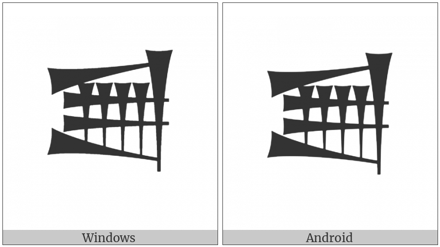 The image below shows how the “Cuneiform Sign Su” symbol might look like on different operating systems. If the font in which this web site is displayed does not contain the symbol and there is no fallback font able to render it, you can use the image below to get an idea of what it should look like.