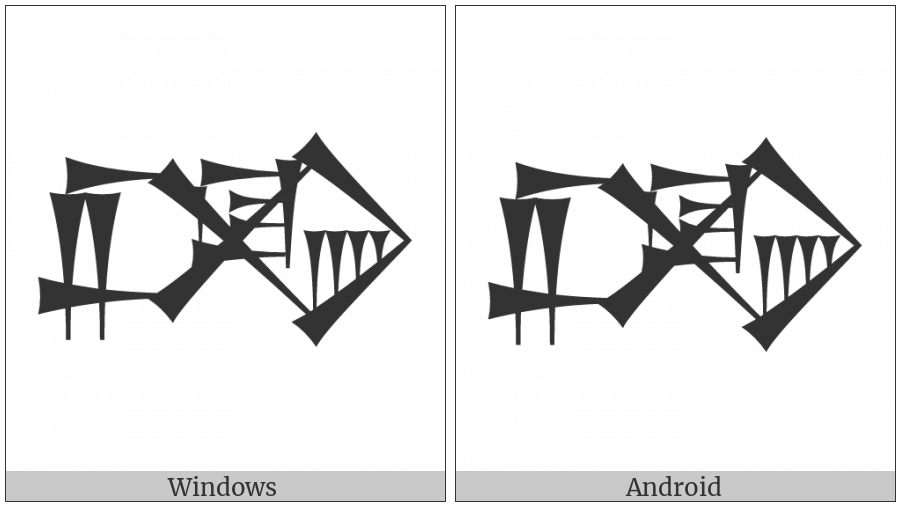 The image below shows how the “Cuneiform Sign Tag Times Tug2” symbol might look like on different operating systems. If the font in which this web site is displayed does not contain the symbol and there is no fallback font able to render it, you can use the image below to get an idea of what it should look like.