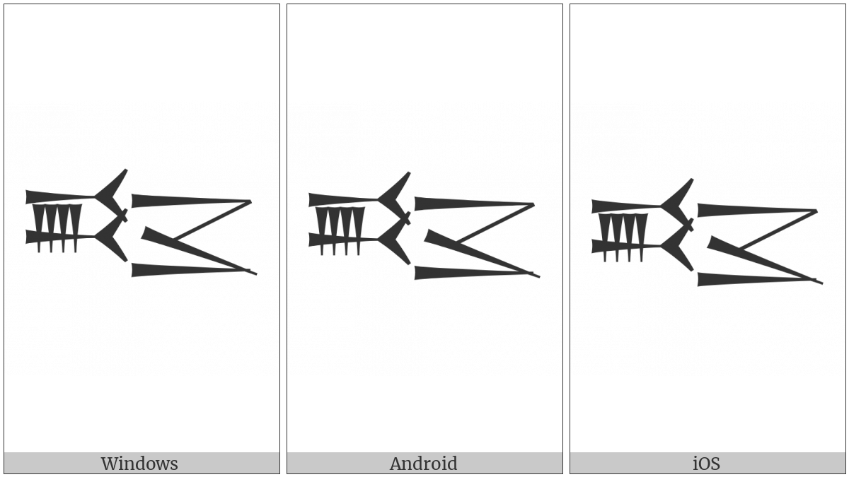 The image below shows how the “Cuneiform Sign Tum” symbol might look like on different operating systems. If the font in which this web site is displayed does not contain the symbol and there is no fallback font able to render it, you can use the image below to get an idea of what it should look like.
