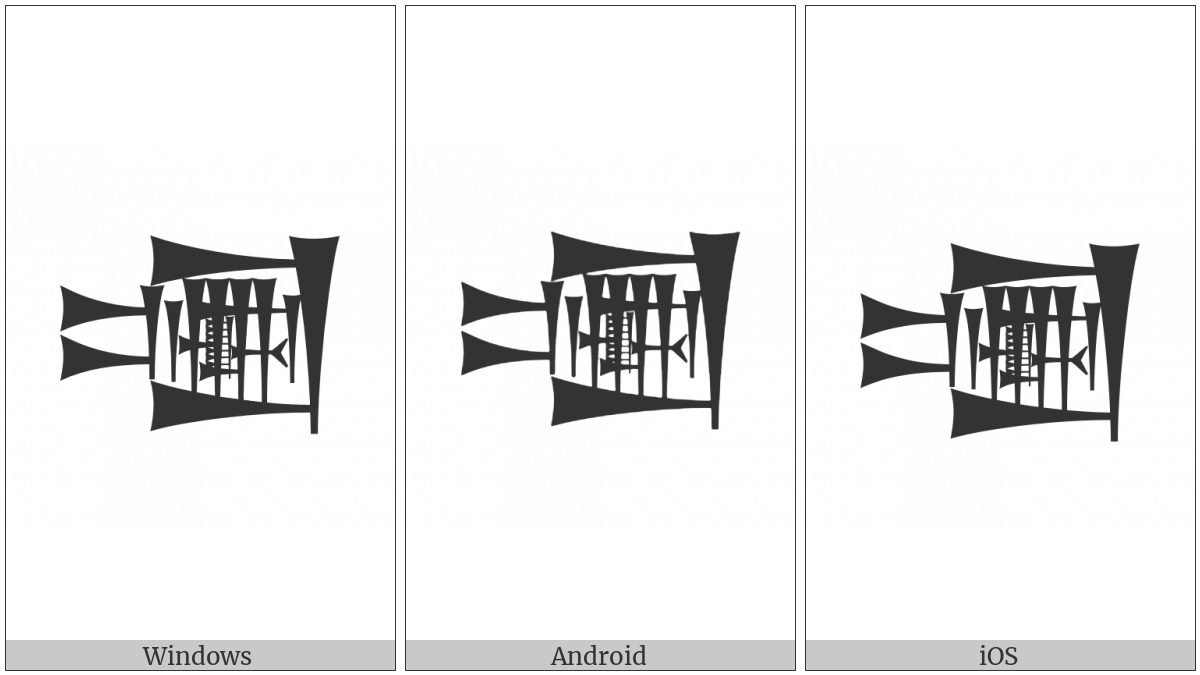 The image below shows how the “Cuneiform Sign Um Times Me Plus Da” symbol might look like on different operating systems. If the font in which this web site is displayed does not contain the symbol and there is no fallback font able to render it, you can use the image below to get an idea of what it should look like.