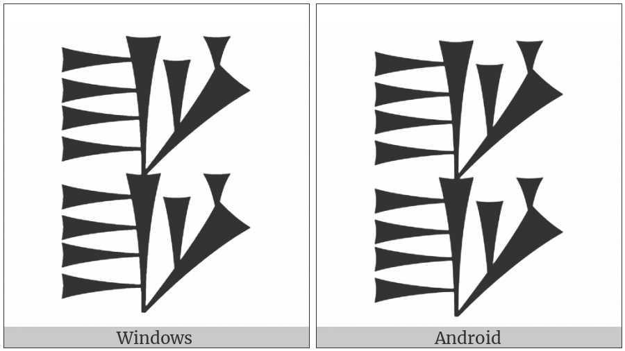 The image below shows how the “Cuneiform Sign Uri” symbol might look like on different operating systems. If the font in which this web site is displayed does not contain the symbol and there is no fallback font able to render it, you can use the image below to get an idea of what it should look like.