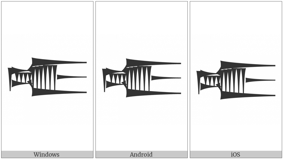The image below shows how the “Cuneiform Sign Zu5” symbol might look like on different operating systems. If the font in which this web site is displayed does not contain the symbol and there is no fallback font able to render it, you can use the image below to get an idea of what it should look like.