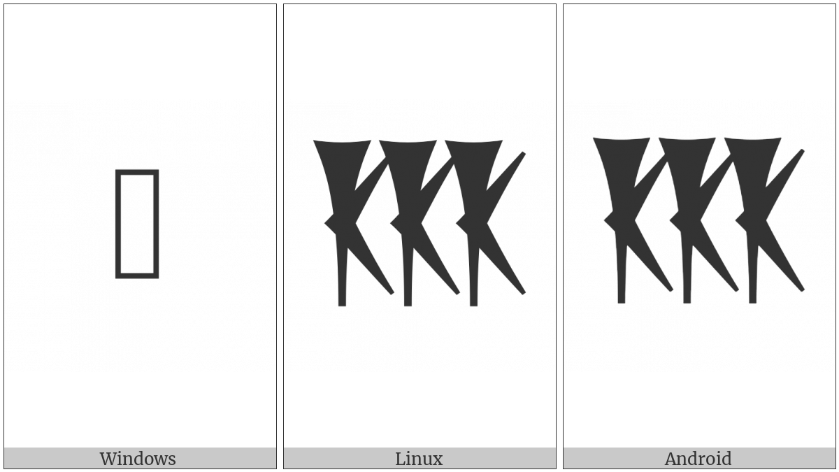 The image below shows how the “Cuneiform Numeric Sign Three Geshu” symbol might look like on different operating systems. If the font in which this web site is displayed does not contain the symbol and there is no fallback font able to render it, you can use the image below to get an idea of what it should look like.