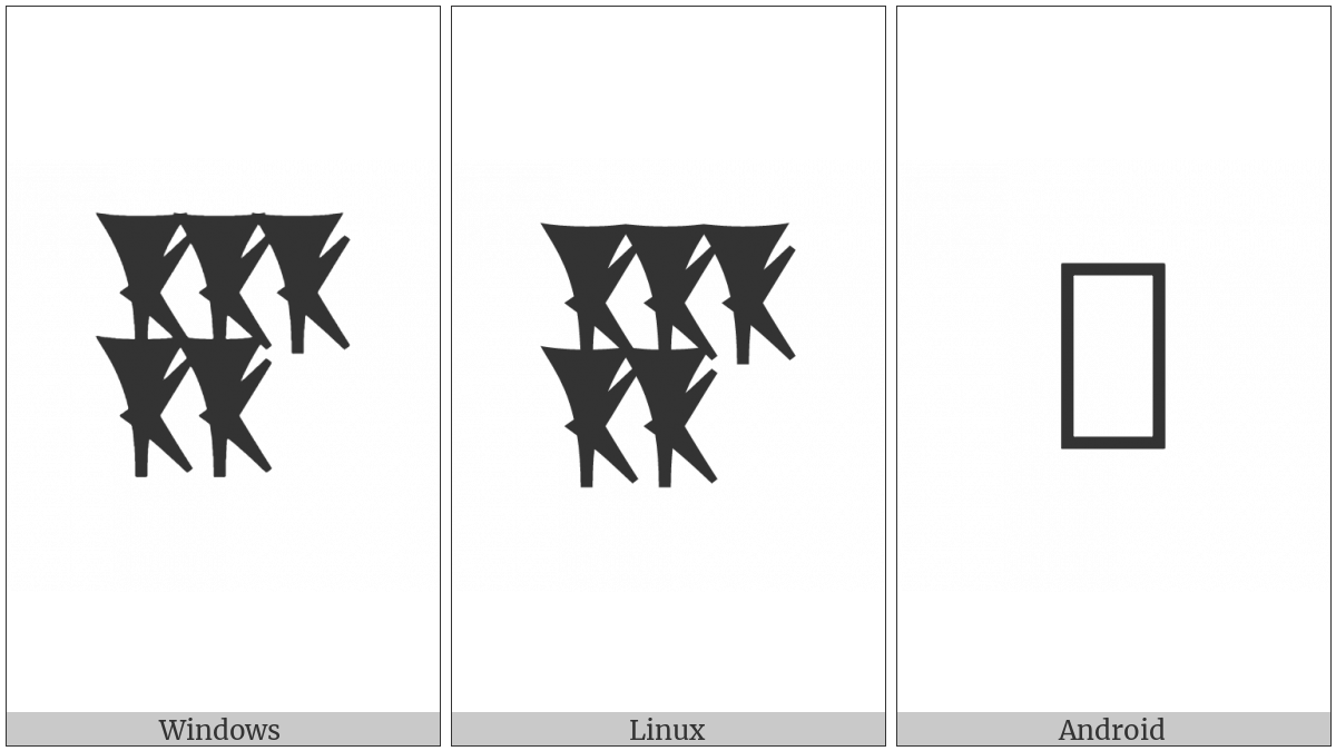 The image below shows how the “Cuneiform Numeric Sign Five Geshu” symbol might look like on different operating systems. If the font in which this web site is displayed does not contain the symbol and there is no fallback font able to render it, you can use the image below to get an idea of what it should look like.