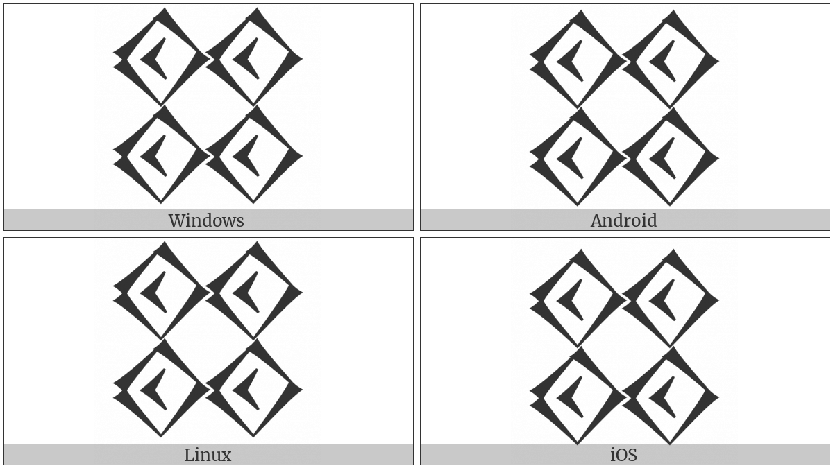 The image below shows how the “Cuneiform Numeric Sign Four Sharu” symbol might look like on different operating systems. If the font in which this web site is displayed does not contain the symbol and there is no fallback font able to render it, you can use the image below to get an idea of what it should look like.