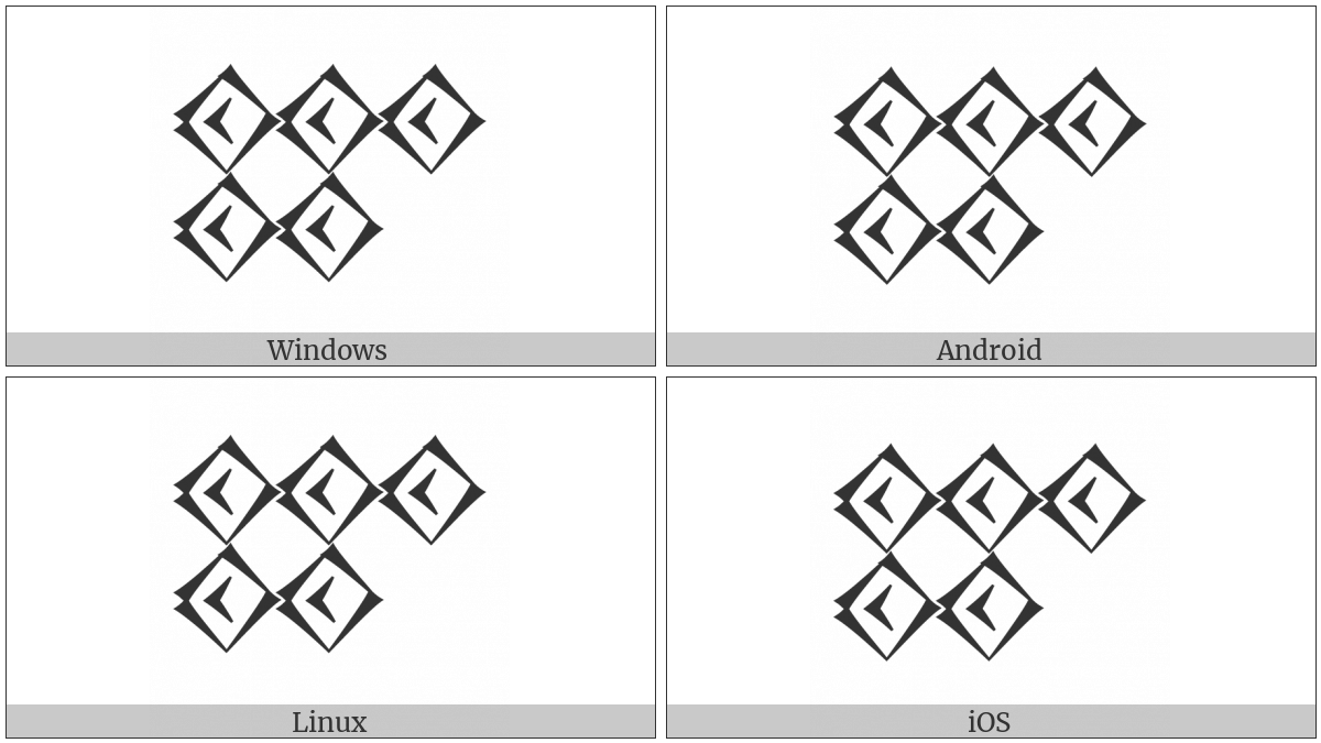 The image below shows how the “Cuneiform Numeric Sign Five Sharu” symbol might look like on different operating systems. If the font in which this web site is displayed does not contain the symbol and there is no fallback font able to render it, you can use the image below to get an idea of what it should look like.