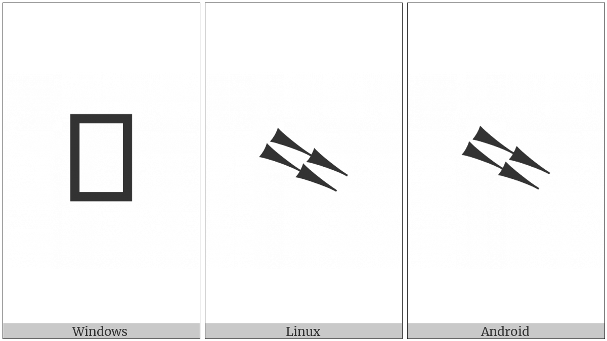 The image below shows how the “Cuneiform Numeric Sign Four Ash Tenu” symbol might look like on different operating systems. If the font in which this web site is displayed does not contain the symbol and there is no fallback font able to render it, you can use the image below to get an idea of what it should look like.