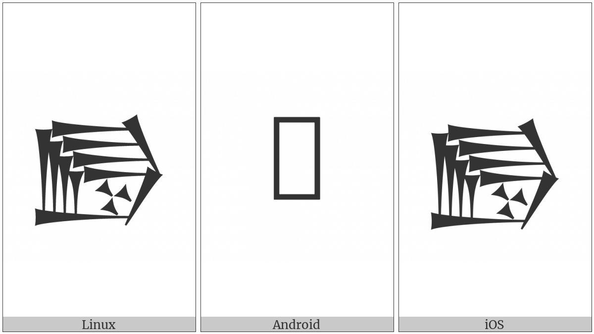 The image below shows how the “Cuneiform Sign Dag Times Kur” symbol might look like on different operating systems. If the font in which this web site is displayed does not contain the symbol and there is no fallback font able to render it, you can use the image below to get an idea of what it should look like.