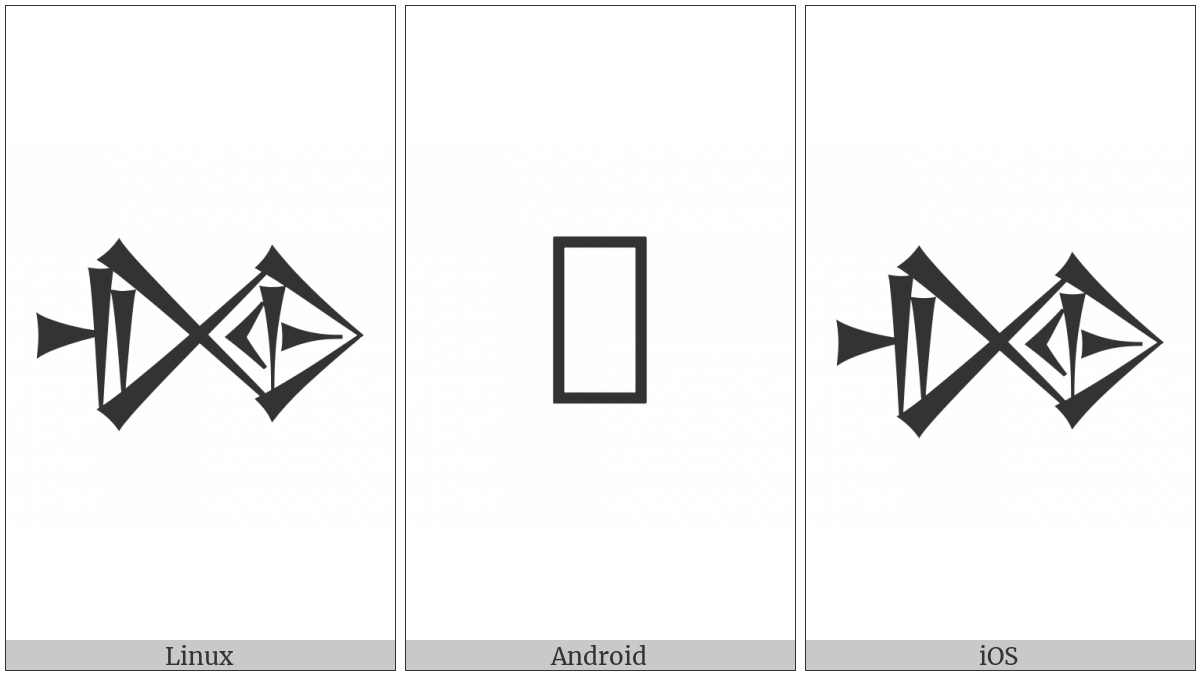 The image below shows how the “Cuneiform Sign Dim Times Igi” symbol might look like on different operating systems. If the font in which this web site is displayed does not contain the symbol and there is no fallback font able to render it, you can use the image below to get an idea of what it should look like.