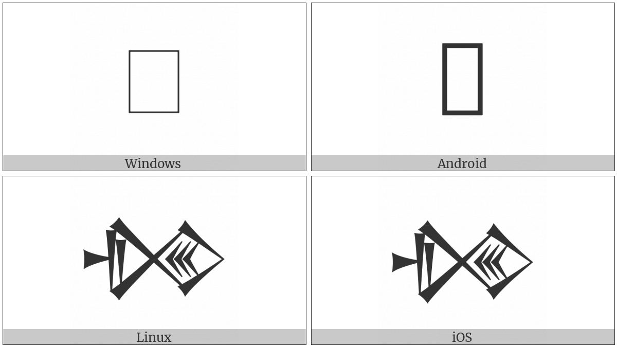 The image below shows how the “Cuneiform Sign Dim Times U U U” symbol might look like on different operating systems. If the font in which this web site is displayed does not contain the symbol and there is no fallback font able to render it, you can use the image below to get an idea of what it should look like.