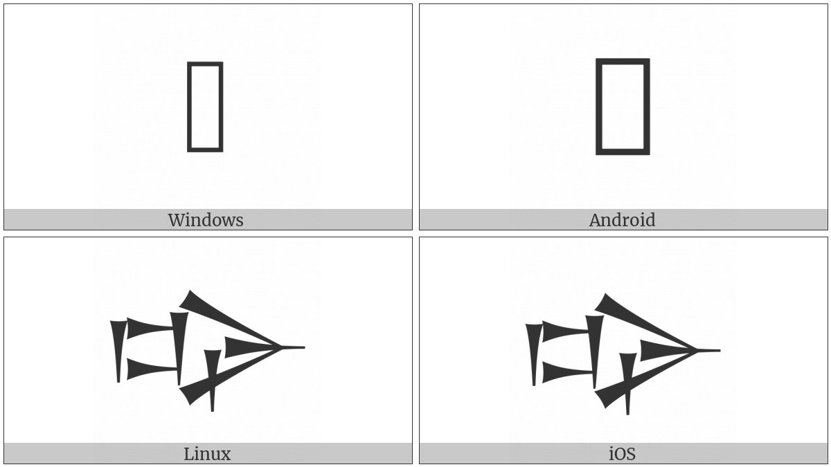The image below shows how the “Cuneiform Sign Dug Times Ash” symbol might look like on different operating systems. If the font in which this web site is displayed does not contain the symbol and there is no fallback font able to render it, you can use the image below to get an idea of what it should look like.