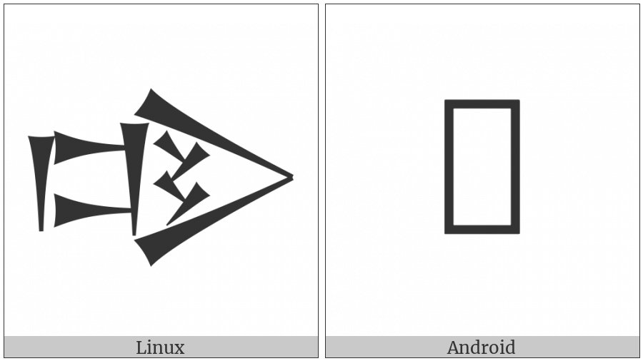 The image below shows how the “Cuneiform Sign Dug Times Erin2” symbol might look like on different operating systems. If the font in which this web site is displayed does not contain the symbol and there is no fallback font able to render it, you can use the image below to get an idea of what it should look like.