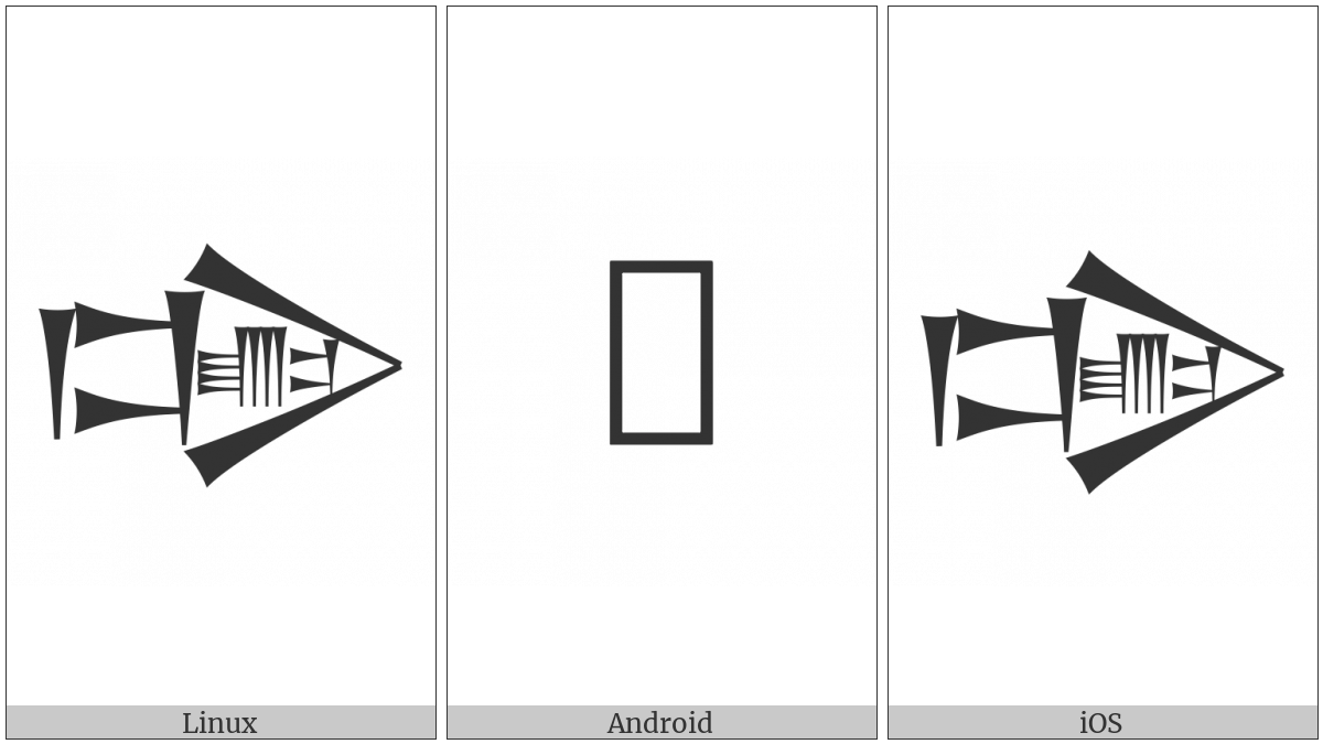 The image below shows how the “Cuneiform Sign Dug Times Luh Plus Gish” symbol might look like on different operating systems. If the font in which this web site is displayed does not contain the symbol and there is no fallback font able to render it, you can use the image below to get an idea of what it should look like.